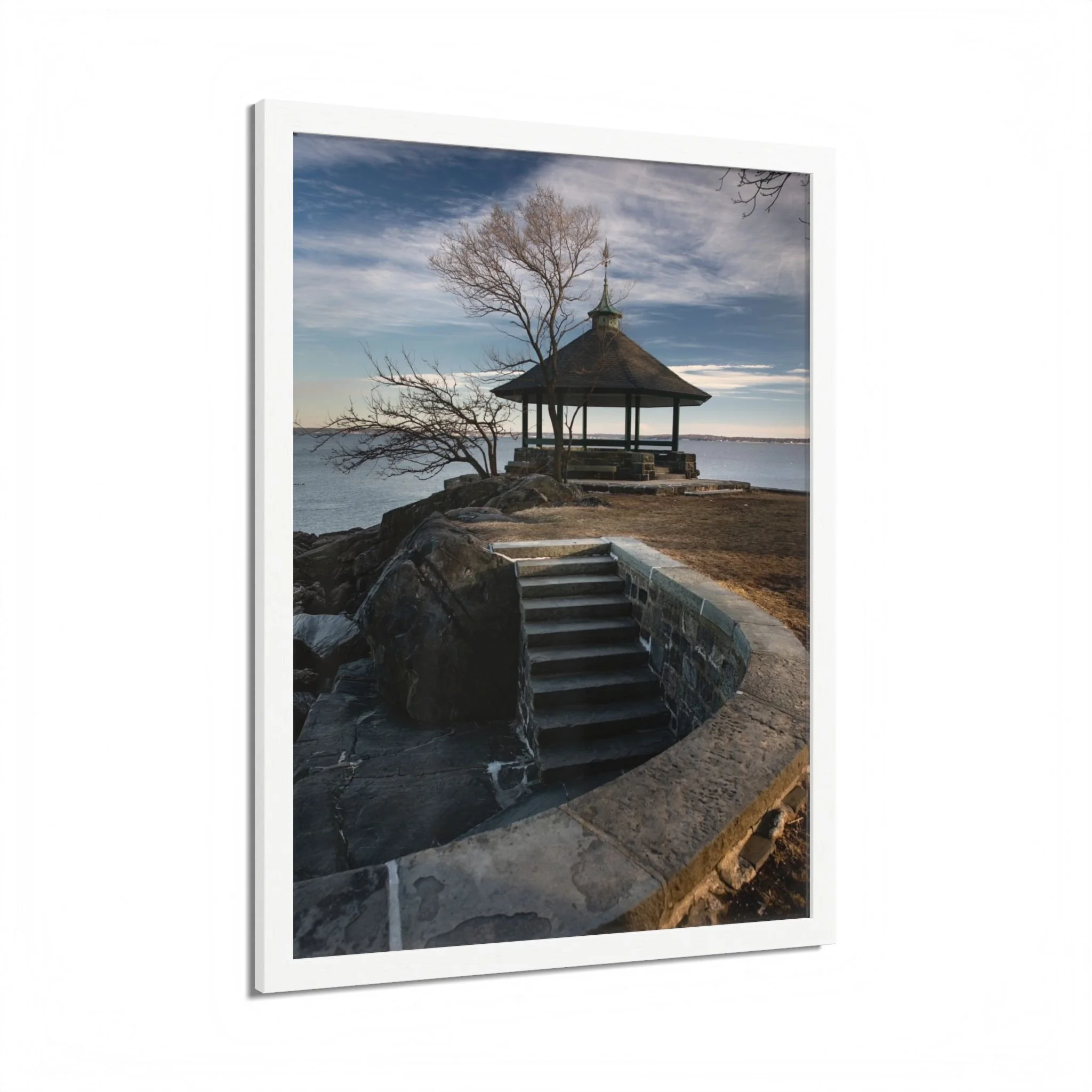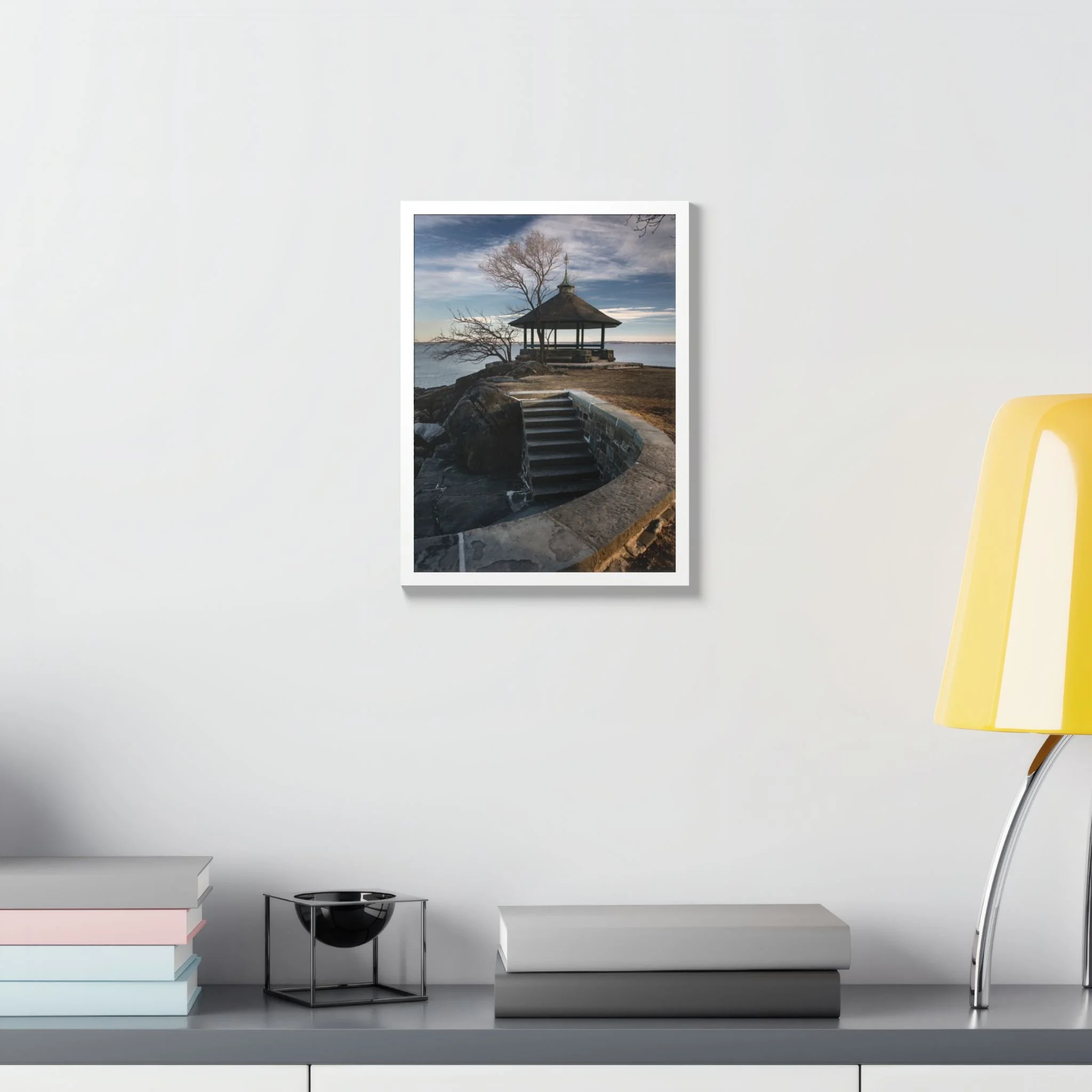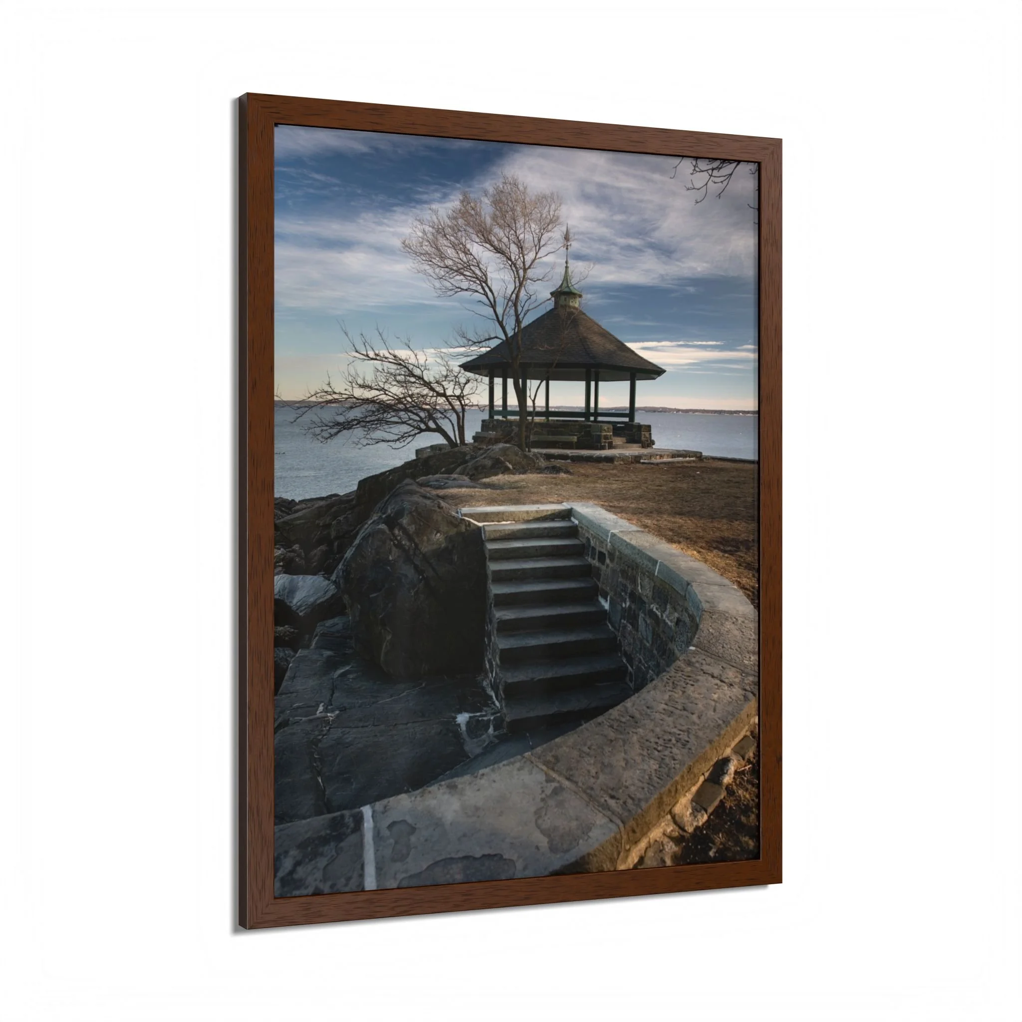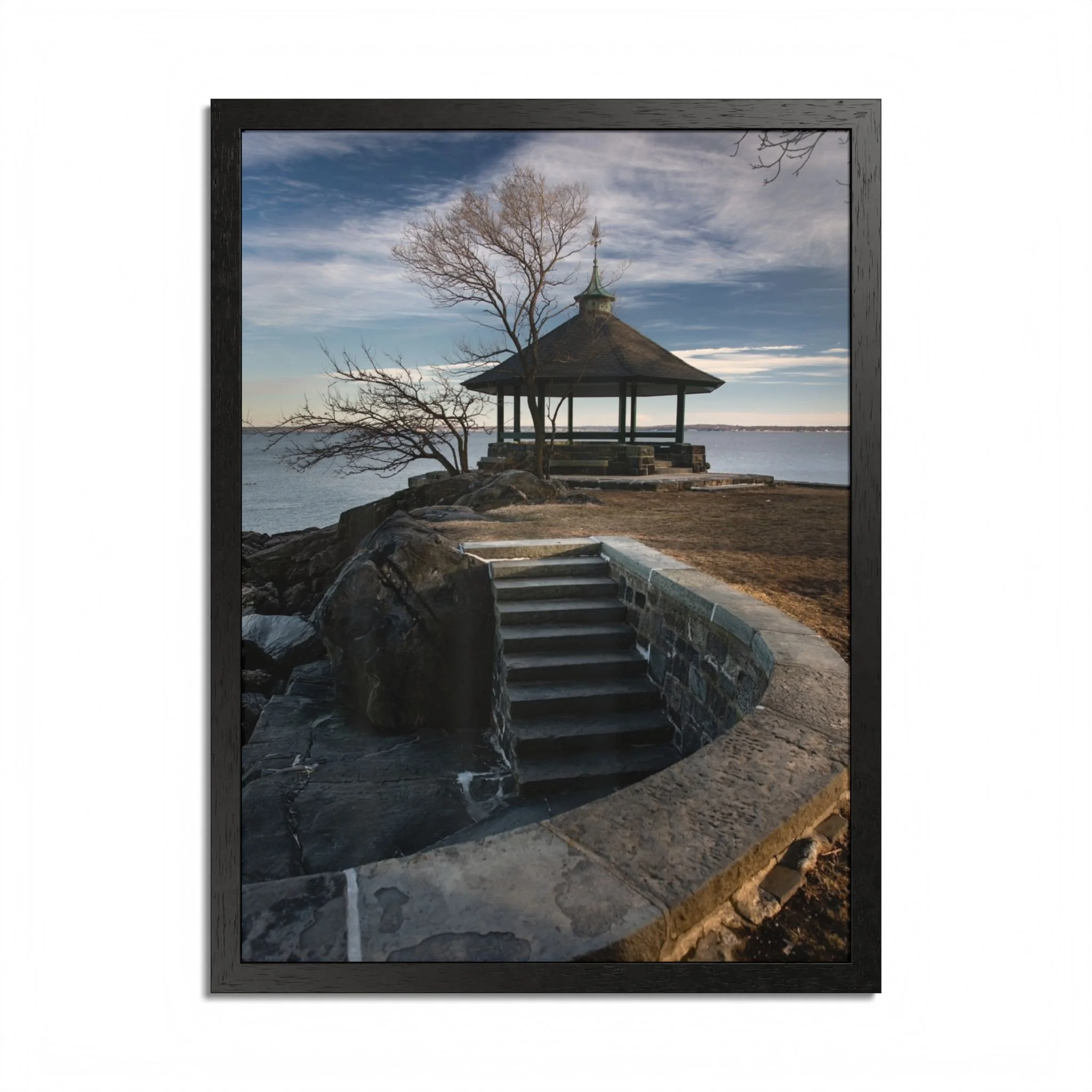 Framed Poster, Sunset at Larchmont Park, Wall Art Print, Rocky Shore Art, Fiery Orange Sky, Multi-Color Decor