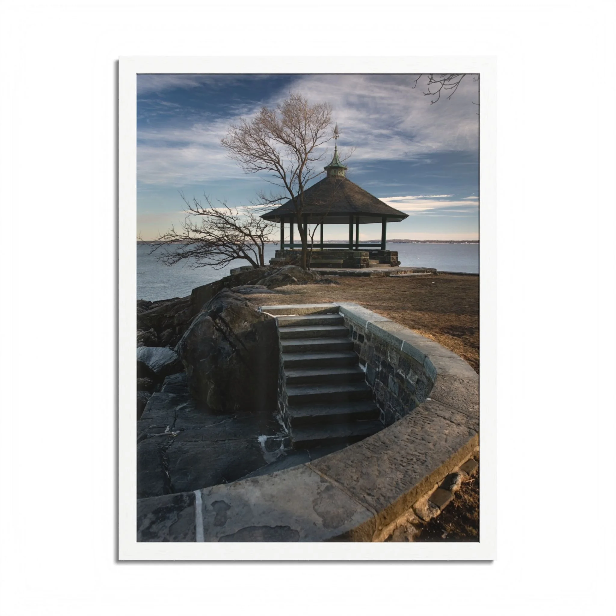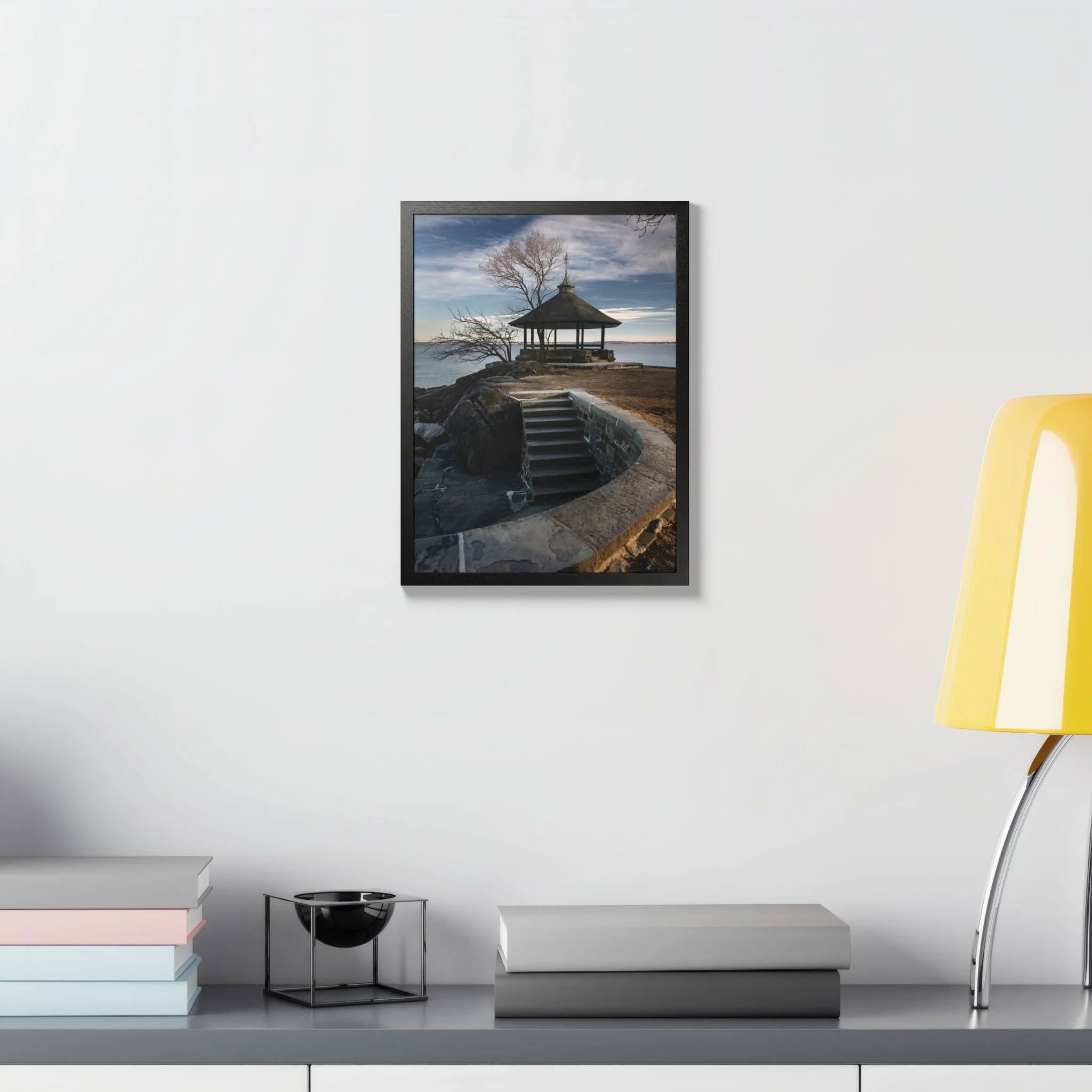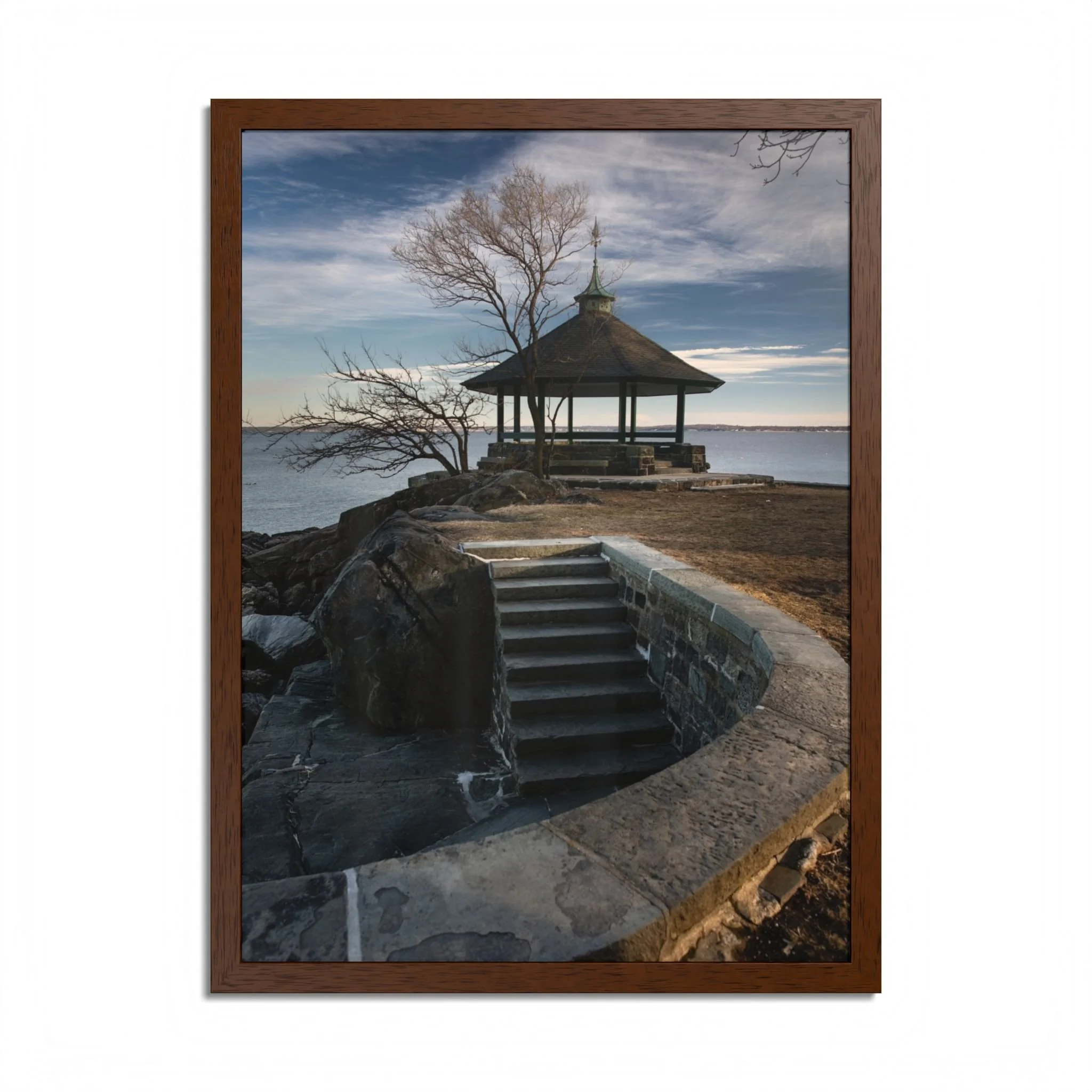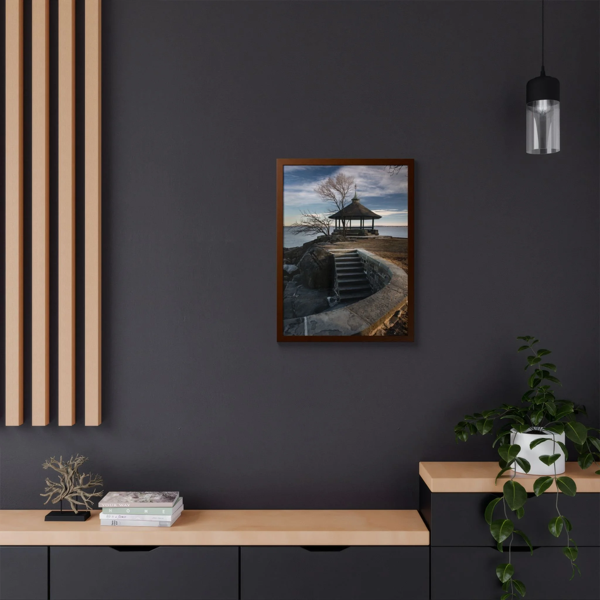 Framed Poster, Sunset at Larchmont Park, Wall Art Print, Rocky Shore Art, Fiery Orange Sky, Multi-Color Decor